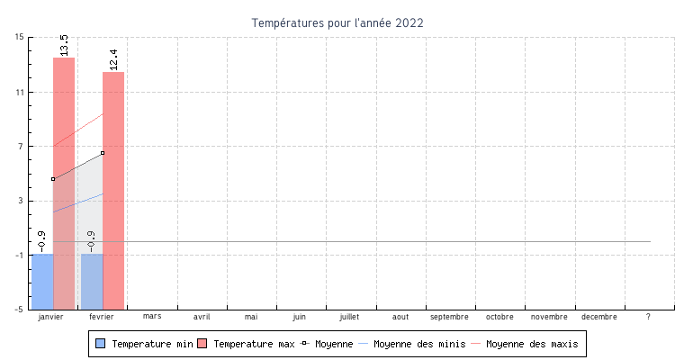 | janvier | -0.9 °C | 2.2 °C | 13.5 °C | 7.0 °C | 4.6 °C | 4.4 km/h | 45.0 km/h | 235 |